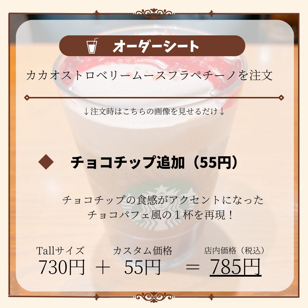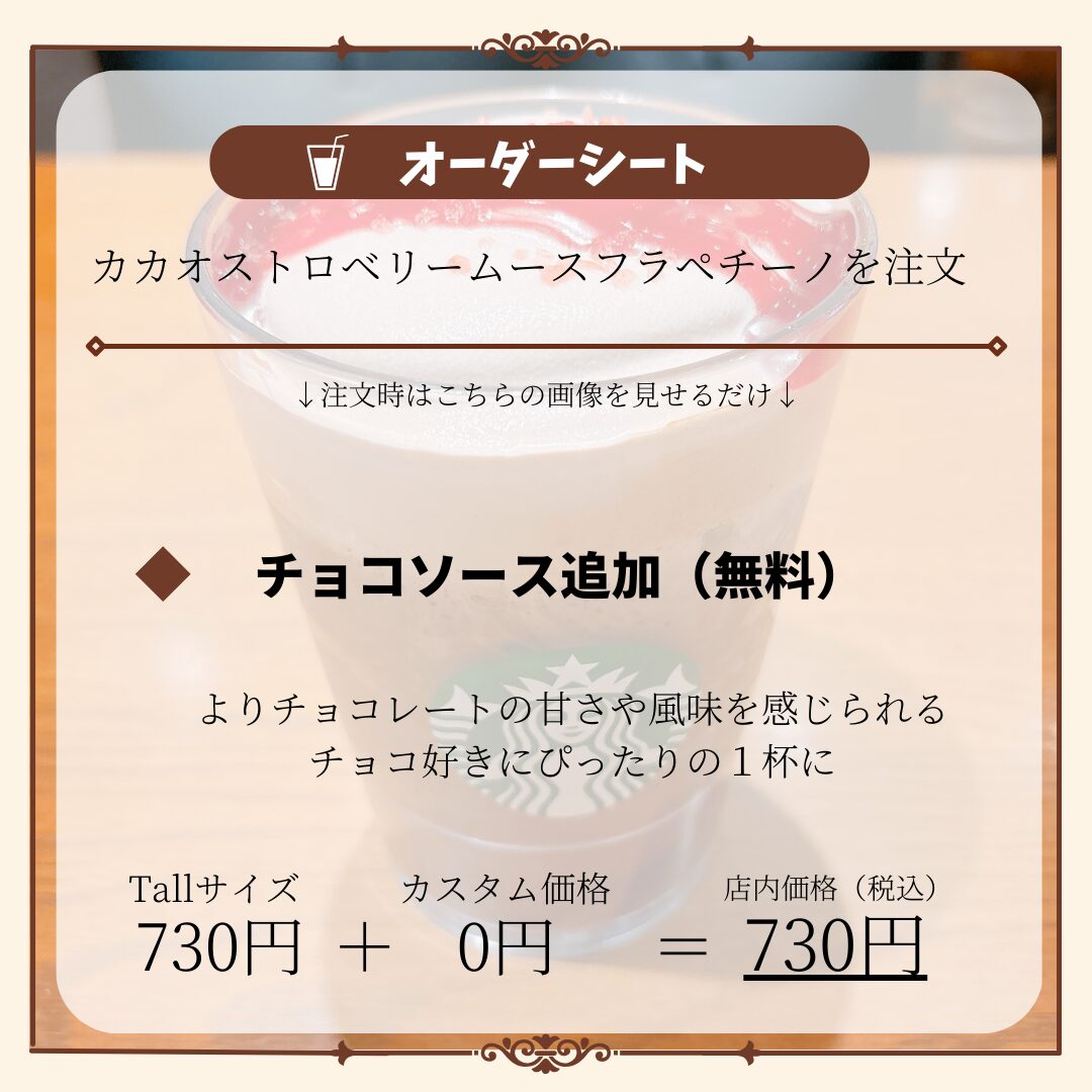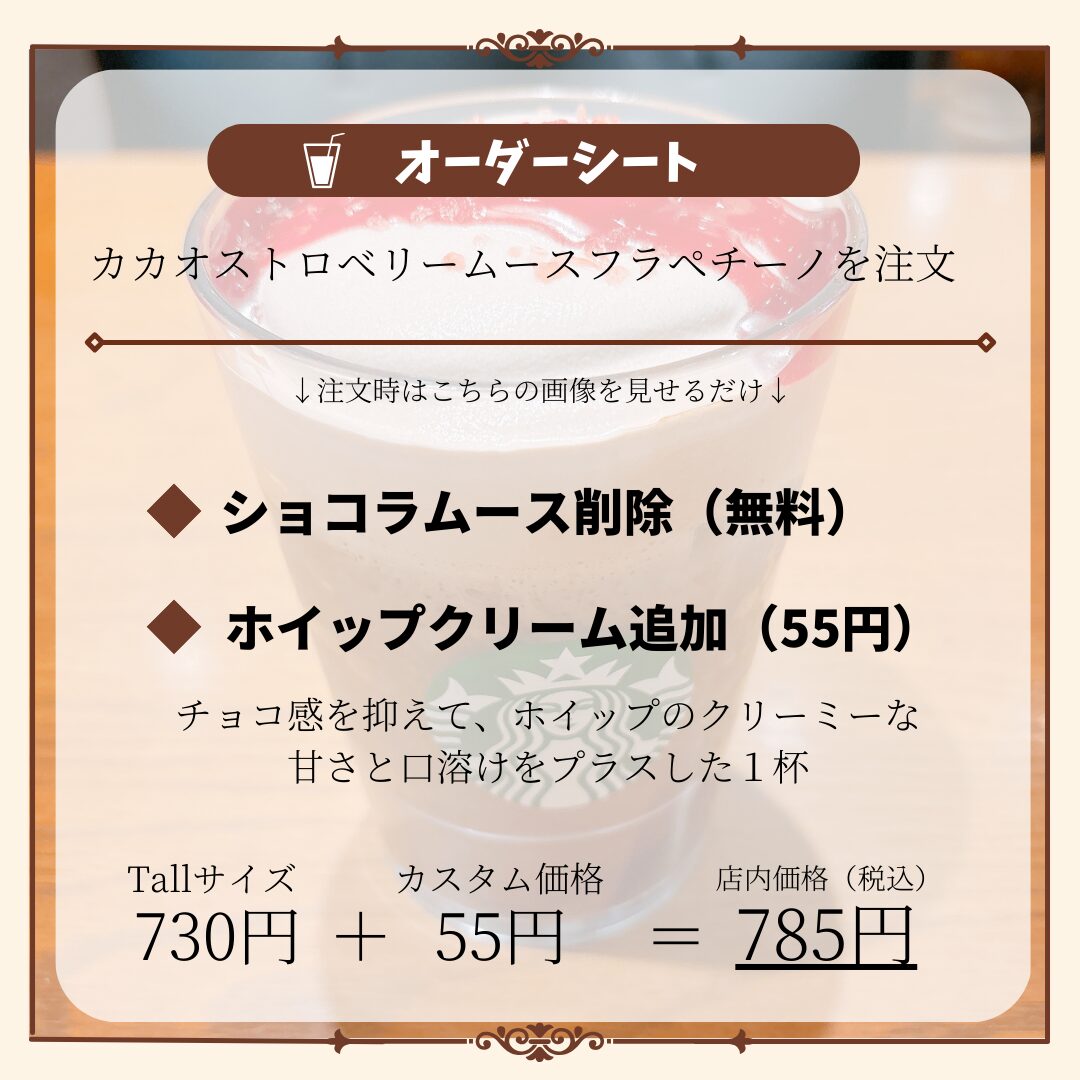 スタバ新作カカオストロベリームースフラペチーノをさらに美味しく味わうカスタマイズは以下の通りです。