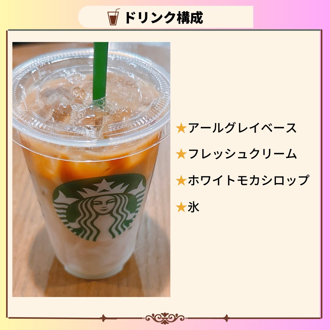 アールグレイベース・ホワイトモカシロップ・フレッシュクリーム・氷が使用されています。