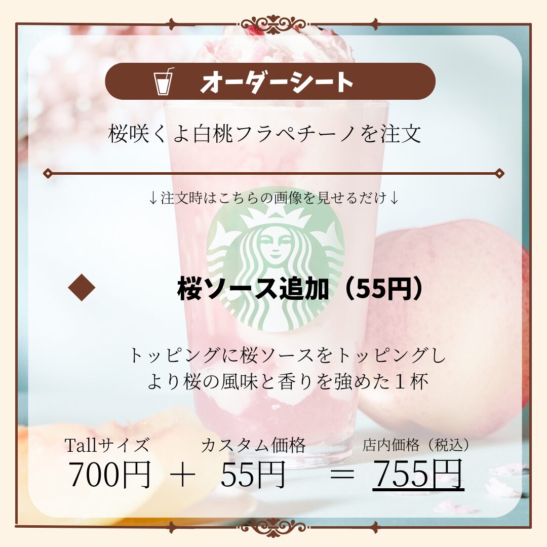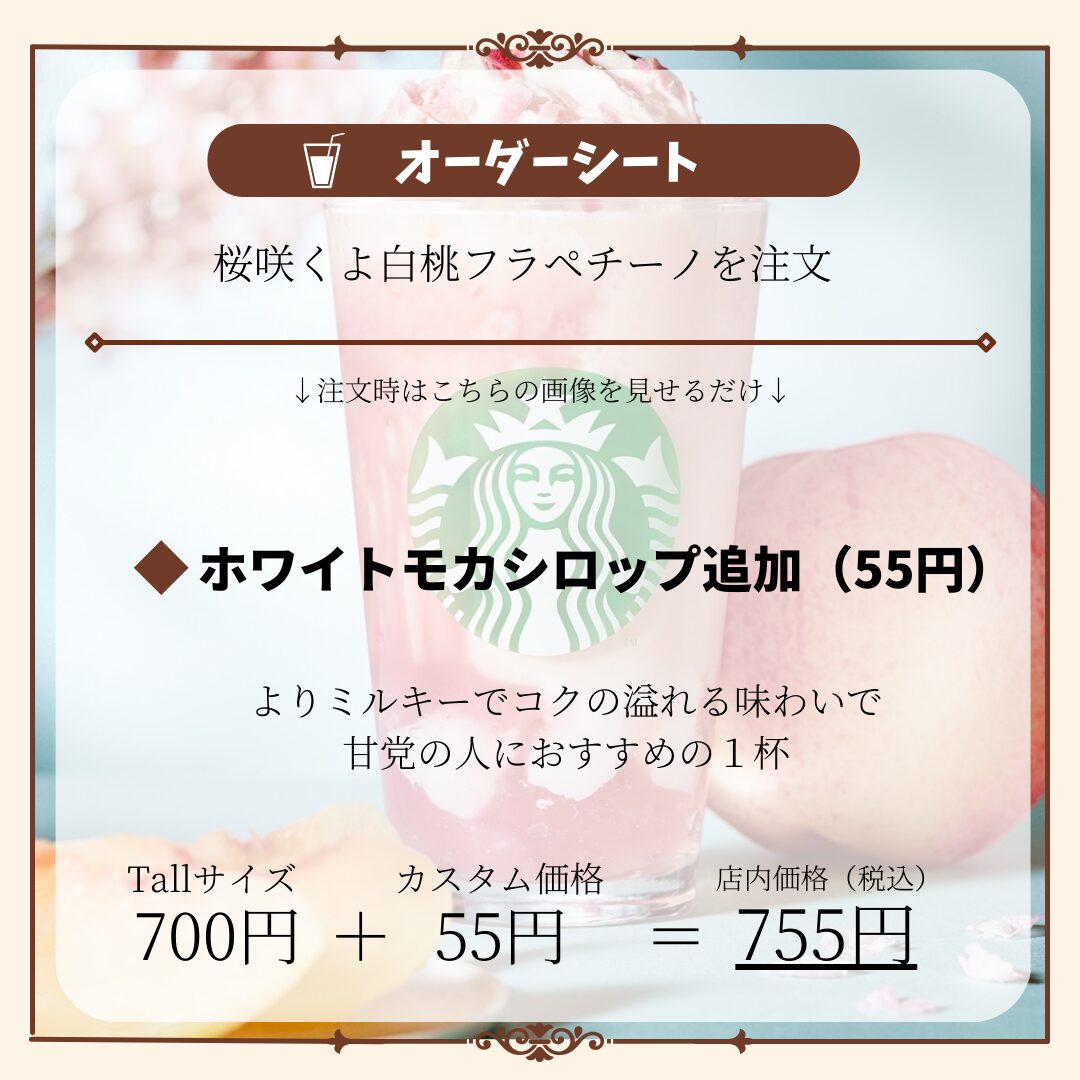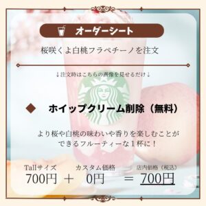 スタバ新作「桜咲くよ白桃フラペチーノ」のおすすめカスタマイズは以下の通りです。