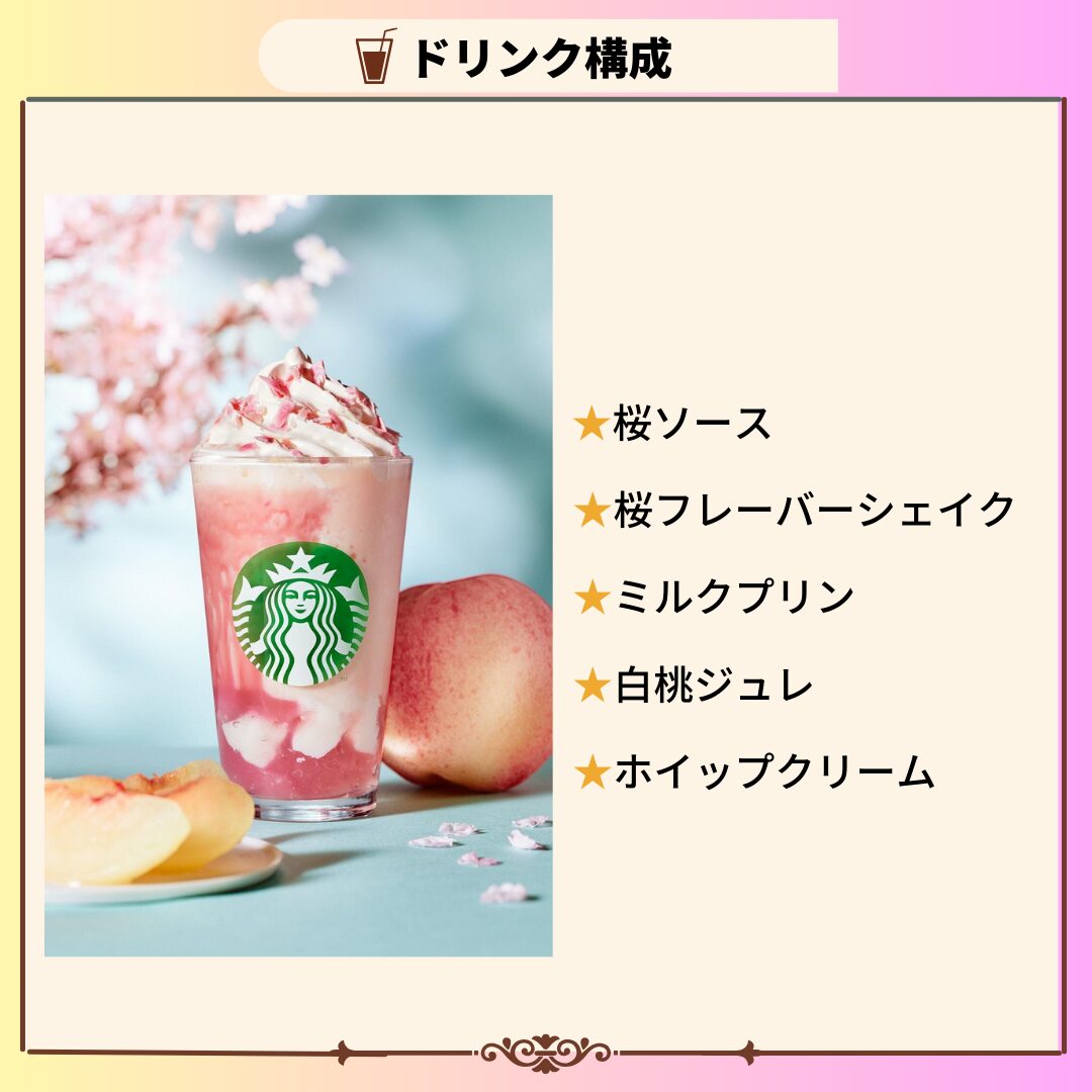 白桃ジュレ・ミルクプリン・桜ソース・ホイップ・桜フレーバーシェイクが使用されています。