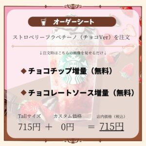 作り方のベースはストロベリーフラペチーノにチョコチップと、チョコソースを追加するだけになります。