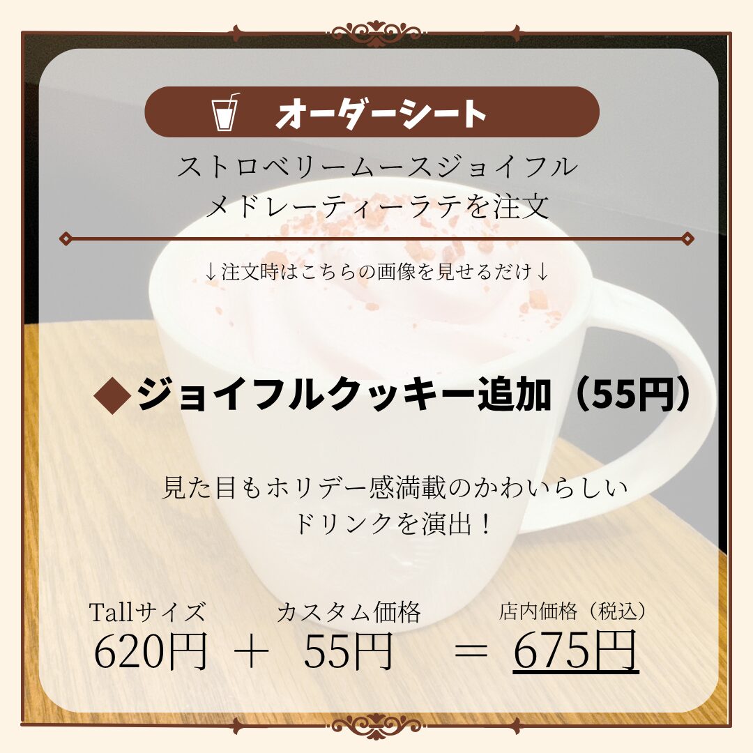 ストロベリームースジョイフルメドレーティーラテでできる無料カスタマイズは上記の通りです。