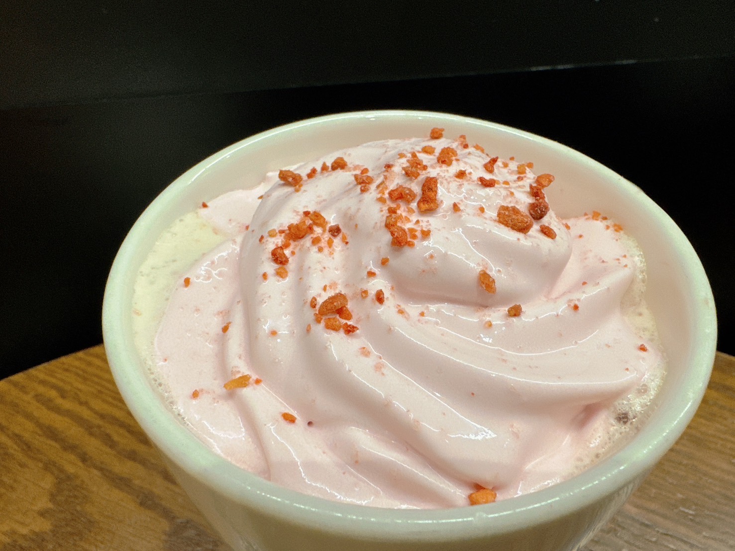 トッピングのフリーズドライストロベリーと、合わせて飲むとよりイチゴの甘酸っぱさを感じることができます!